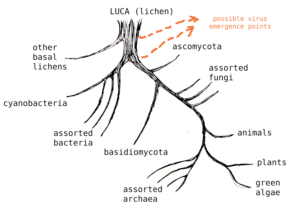 Imagine picking the tree up by one of those lichen lineages. While it’s a little unorthodox, we can actually just slightly rearrange the map to understand the proposed Lichen-As-Common-Ancestor model.
