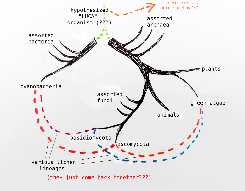 Remember that this is approximate – our understanding of cladistics might change once re-evaluated under the Big Lichen assumption. Also, I could have drawn it wrong.