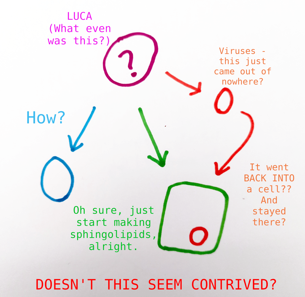 “Mainstream” biology will tell you that this LUCA was an extremely minimal critter, probably sort of a cobbled-together organism that was one of the simpler possible collections of biological systems that could be self-sustaining. All complexity of cellular life developed slowly over time from accumulated random mutations.