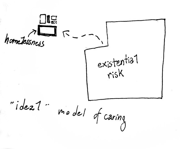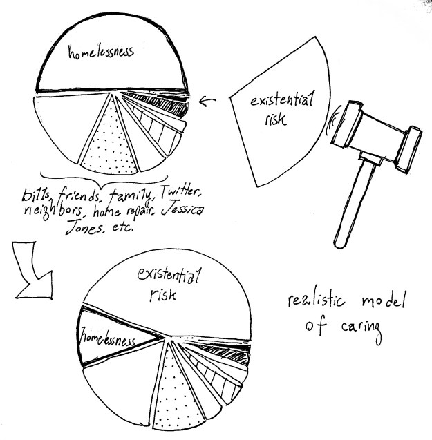 Avery also doesn’t stop caring about homelessness – not at all. But as a result of caring so much more about existential risk, they do have to care less about homelessness (in any meaningful or practical sense) as a result.