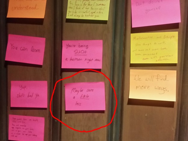 Photo taken at the 2016 Bay Area Secular Solstice. During an intermission, sticky notes and markers were passed around, and we were given the prompt: “If someone you knew and loved was suffering in a really bad situation, and was on the verge of giving up, what would you tell them?” Most of them were beautiful messages of encouragement and hope and support, but this was my favorite.