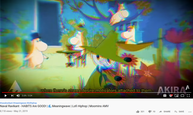 A confusing Youtube project: “meaningwave”, which features glitchy visuals, soft electronic music, and clips from motivational speakers. Notably Jordan Peterson, but also Alan Watts and Mr Rogers. Dozens of videos, all made by the same person. I don’t like Jordan Peterson but I can recognize when the universe drops something bizarre and beautiful into my lap. This one is my favorite, featuring Naval Ravikant on habits and clips from the Moomin TV show.